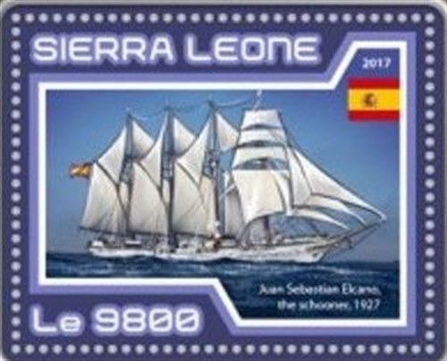 The 12c. stamp depicts the Spanish topsail schooner Juan Sebastian de Elcano, previously shown on aspanish 10p. stamp of 1964. Built by Echevarrieta y Larrinaga at Cadiz, in March 1927, she has a displacement at 3/4-load of 3,420 tons. Overall length is 308 ft beam 43 ft.; full load draft 23 ft. She carries four 6-pdr. guns. Her single Sulzer oil engine develops 800 b.h.p. giving her a speed of 9 knots. She carries 230 tons of oil; and is a single-screw vessel, with a range of 10,000 miles at 9.5 knots. The ship's complement is 224, with 80 cadets. The vessel is named after the first circumnavigator of the world, 1519-1520. She was designed by Mr. C. E.Nicholson, of Camper and Nicholsons Ltd., Southampton.