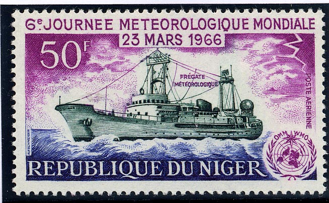 On March 23rd 1966 the Republic of Niger commemorated World Meteorological Day by the issue of a splendid ship stamp showing a weather ship, either the France I or France II, sister ships built in 1959 by the Societe des Forges et Chantiers de la Mediteranee, Havre for the Meteorological Department of the French Government.
