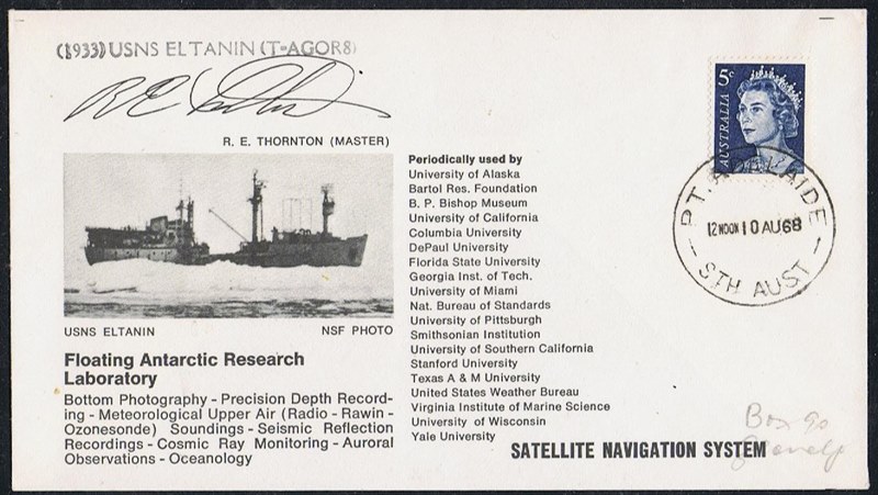 This envelope from Australia dated 10 August 1968 shows us the USA research polar vessel USNS ELTANIN (T-AGOR8)