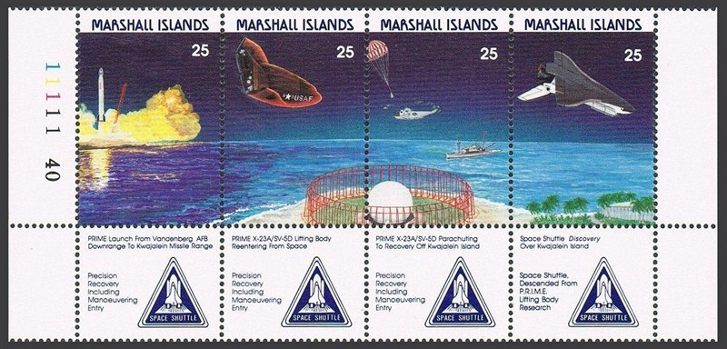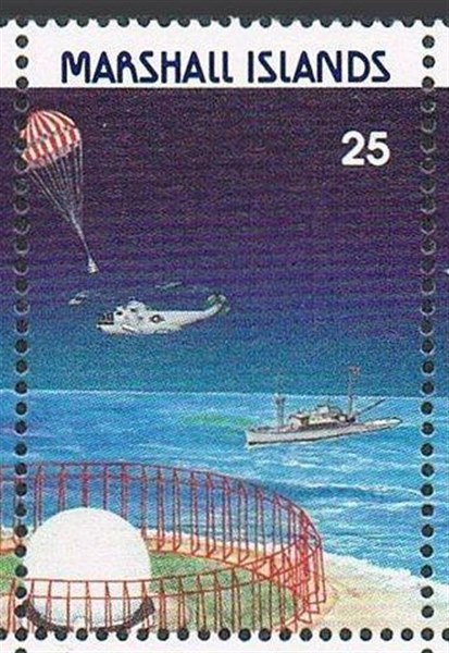 For the Space Exploration: 30th Anniversary of NASA. The Marshal Islands issued in 1988 four stamps, of which one depict a vessel, comparing stamp with photo’s it must be one of the Diver class rescue and salvage ships. I can only find one ship of this class used as a tracking and recovery ship, she is the USS PRESERVER (ARS-8). Most probably this ship is depict. I can’t find conformation that she was used by the recovery of the three PRIME SV-5 at the Marshall Islands.