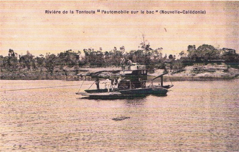 The Tontouta is also a pontoon ferry with a bow and stern ramp, but she is not motorized, but pulled by a cable across the river as seen on the stamp, where two men pulled her across the river.