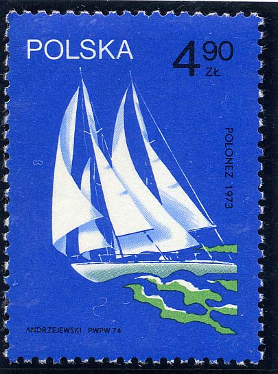 4.90 zi. features the Polonez, a sailing ship of regattas as well as the high seas, built in Poland at the boat yard at Stettin (Szczecin). She is adapted for single‑handed navigation. It was aboard this yacht that Krzysztof Baranowsky, Polish navigator and also a journalist, after completing a lone trans‑Atlantic voyage in the years 1971‑1973 made a round the world cruise, very successfully.