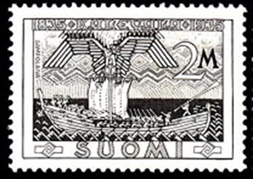 For the 100th anniversary of the publication of the epic poem Kalevala, Finland issued three stamps in 1935 which shows on the 2,00 M stamp a type of Viking ship in which the hero of the epos Väinämöinen escaped with the “sampo”, made by the blacksmith Ilmarinen.