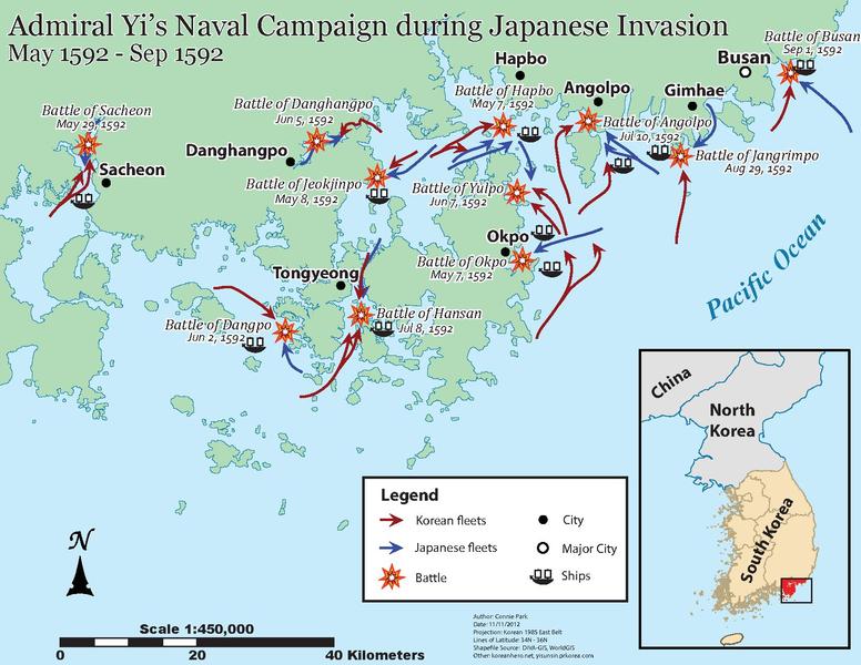 The Battle of Hansan Island and following engagement at Angolpo took place from 14 to 15 August 1592. In two naval encounters, The Korean Admiral Yi Sun-sin's fleet managed to destroy roughly 100 Japanese ships and halted Japanese naval operations along the southern coast.