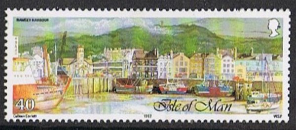 40p Ramsey is the second busiest harbour on the island, dealing with mixed cargo, fishing and pleasure craft. The red hulled cargo vessel on the left of the stamp is the GLENFYNE,