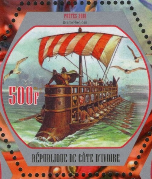 The testimonies of ancient authors, largely illustrated nowadays by archaeological finds and scientific reconstructions, enthrallingly describe the "affairs of bygone days" in the history of the culture of mankind. A clear example of this is the development of shipbuilding and navigation, the construction of ports and lighthouses. In ancient times people settled along the banks of rivers, lakes and seas. The water was convenient by way of communication and trade, and man mastered this path first on boats and then on ships. Great masters-shipbuilders and skillful navigators of antiquity were considered Phoenicians. In the technology of shipbuilding, they adopted much from the Cretans, who, according to the researchers of antiquity, were the first to apply keel and frames, which increased the strength of the hull. It is believed that, thanks in part to these technical improvements, Crete was the first sea power in the Mediterranean. Gradually other nations - the Etruscans, Greeks, Carthaginians and Romans begin to challenge the Phoenicians dominant position in shipbuilding. The desire to increase speed, maneuverability, the impact force of a ram against an enemy ship led to the appearance of ships with two, three, four and five tiers of oars. For several centuries Rome had no rivals at sea. Hundreds of oarsmen with muscular power set in motion biremes, triremes (the Greeks called these ships of the trireme), quintiles and penthers. History knows the ships of the Ancient World and with a large number of tiers of oars. The invention of the sail greatly improved the maneuverability of the ships and allowed covering long distances. However, the first sailing armament initially consisted of a straight rake sail, which could only be used with a favorable wind. The longship was a type of ship that was developed over a period of centuries and perfected by its most famous user, the Vikings, in approximately the 9th century. The ships were clinker-built, utilizing overlapping wooden strakes. On the sheetlet of Gabon depict ancient battle sailing-oared ships: