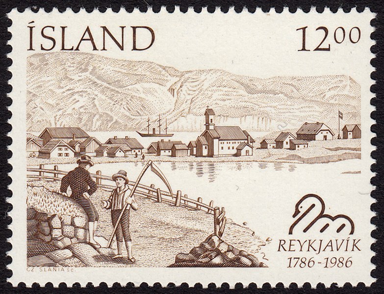 Iceland issued in 1986 four stamps for the “Bicentenary of the City of Reykjavik” of which the 12 Kr stamp shows us an 1856 view from the banks of the Tjörn (Pond) with in the background the bay of Reykjavik. By the stamp is given by the Icelandic Post: