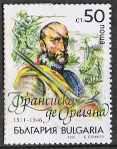 They left the river on August 26, and eventually reached Cubagua, just North of Trinidad, safely, the San Pedro on September 9, 1542 and the Victoria two days later. The voyage, down an unknown river, fighting Indians on many occasions, took 8'/2 months to complete. The stamp shows the San Pedro reaching the open sea, at the mouth of the Amazon, and a map of the journey from the West Coast to El Barco of Pizarro and the voyage of discovery down the Amazon of Orellano are depicted by an early cartographer's map on the second stamp. (SG683)