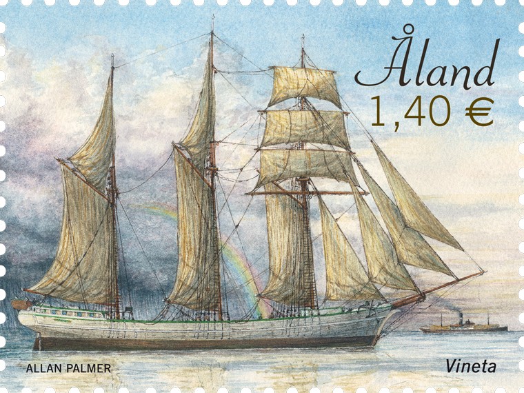 After World War I, seaborne trade enjoyed a boom that provided an opportunity for a short-lived renaissance of the building of sailing vessels in Åland. The largest Åland peasant shipping company of the inter-war period was Varvs- & Rederi Ab Viking founded in Saltvik in 1917. Three-masted schooner VINETA was the only new-building of the company, and she was launched in November 1919. Having sailed the Baltic and North Seas for eight years, she ran aground in a winter storm and wrecked just off Swedish island of Gotland. In the same year 1927, the Viking company was dissolved when the board deemed the era of smaller sailing ships over. The artist’s illustration of VINETA, with rain-soaked sails in a dead calm, being overhauled by a fully loaded steamship, is a reminder of the new times.