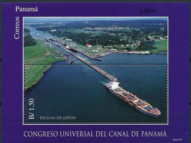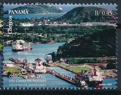 Panama issued in 1997 two stamps and a miniature sheet for the World Congress 1997 on the Panama Canal. There are many ships depict on the MS and stamps, but only one ship is till so far identified, the red-hulled ship entering the Pedro Miguel lock is the RoRo vessel BARBER TONSBERG.