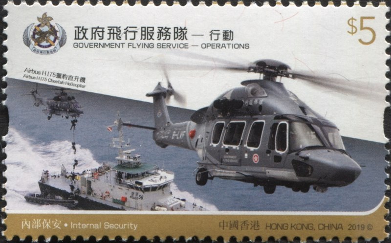GFS offers support to various disciplined services in their discharge of duties to maintain the internal security of Hong Kong, resulting in better efficacy in tackling potential threats of all kinds. The Airbus H175 Cheetah Helicopter showcased in the $5 stamp is the newest GFS aircraft. It is installed with state-of-the-art equipment to meet the needs of internal security and diverse missions.