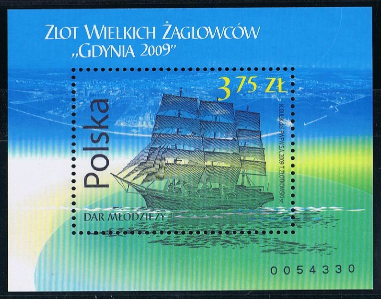 On the occasion of the Tall Ships' Races, Poczta Polska issued a stamp in block. The stamp presents a silhouette of "Dar Mlodziezy" against the panorama of the port of Ddansk. "Dar Mlodziezy" is a frigate built in 1982 that belongs to the Naval Academy of Gdynia. The FDC envelope presents the ships as though they were observed through field glasses - equipment worth having during such an event as the races in Gdynia. The issue is accompanied by an occasional date stamp in use in Gdynia 1 Post Office.