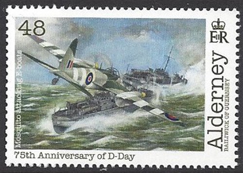 The stamp is not so clear, but gives “Mosquito attacking E-boats, the first E-boats attacking the Allied landings fleet were the ships from the German 9th schnellboot Flotilla based in Cherbourg, France. Which ships was depicted I could not find.