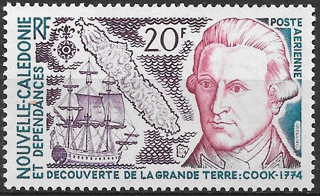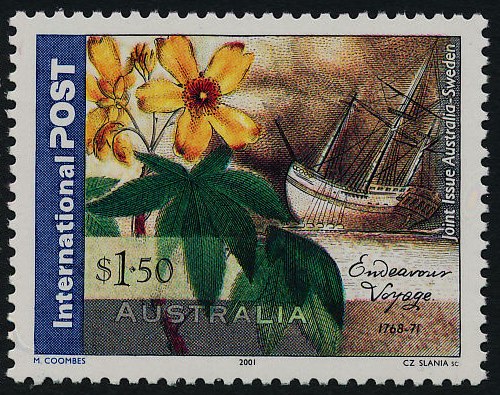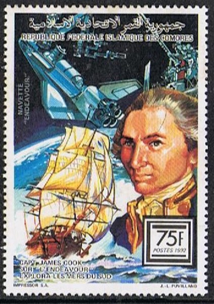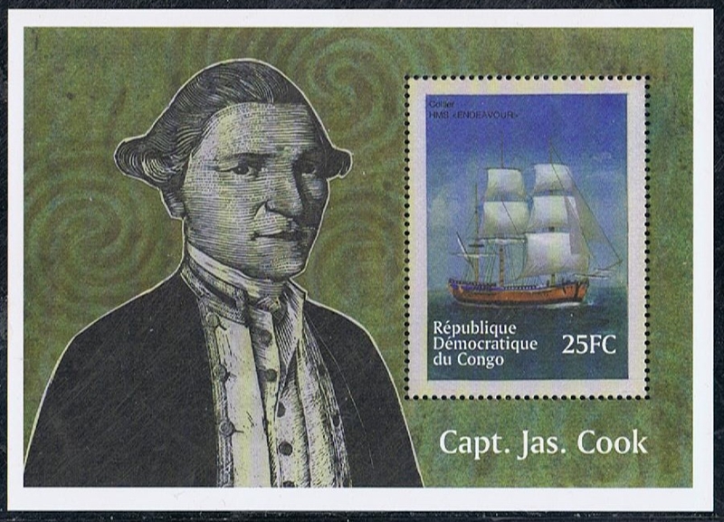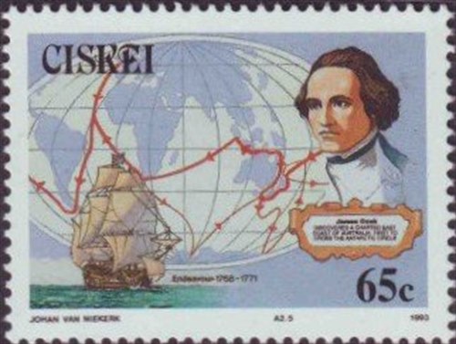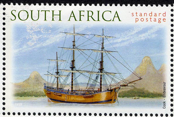 The stamp shows us Captain Cook in Australia with in the background HMS ENDEAVOUR during the flag hoisting, when Cook claims the country for Great Britain.