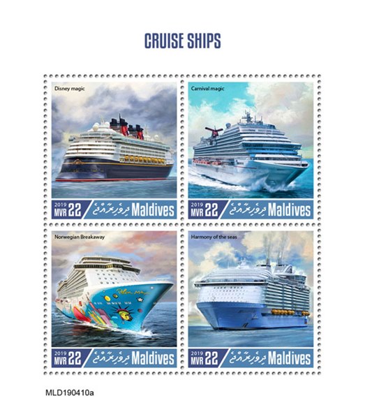 2019 Maldives cruise vessels on stamps. Four stamps of MVR 22 and a MS of MVR70