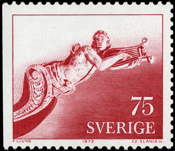 The stamp shows the figurehead of the Swedish yacht AMPHION.