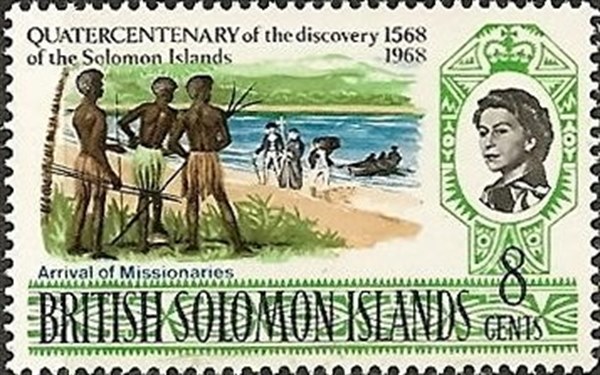 The stamp issued by the Solomon Islands shows the arrival of the first missionaries on the islands. Not a vessel is shown on the stamp only a ships boat in which the first missionaries landed. I found that she traveled by the chartered schooner MARIAN WATSON.