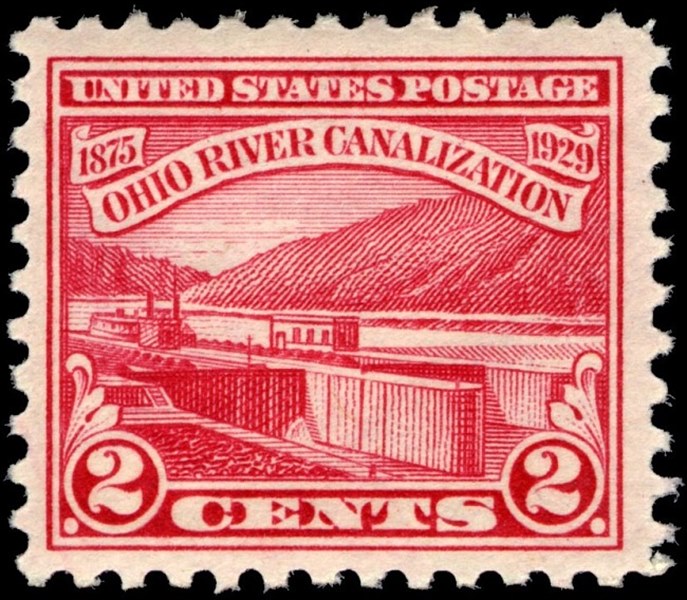 The stamp was issued in 1929 to commemorate the completion of the Ohio River Canalisation, the stamp is designed after a photograph of an official U.S. Army Corps of Engineers photo of the towboat H.D. WILLIAMS in the Monongahela River Lock No 5 at Brownsville, Pa on 4 October 1920