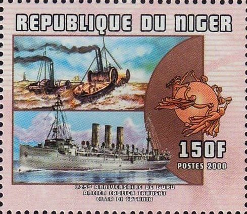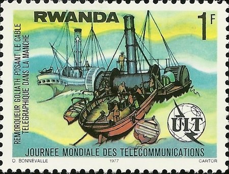 Rwanda and Niger issued the same stamp design, which shows us the first cable laid between the U.K. and France. Both stamps show us the cable-layer GOLIATH viewtopic.php?f=2&t=10734&p=14848&hilit=goliath#p14848 and behind her the packet vessel WIDGEON.