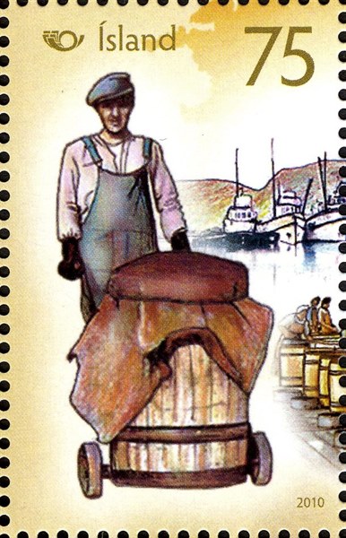 In 2010 Iceland issued two stamps and a miniature sheet which shows us how the herring was processed after she was landed onshore. In the early sixties, I have been a few times in Iceland to load salted codfish for the Mediterranean, returning to Iceland with a cargo of sea-salt. I have seen at that time still the herring trawlers coming in loaded to the gunwales with herring. The filling women were gone from the quays as seen on the stamps. More on this women is given on https://www.atlasobscura.com/articles/h ... of-iceland