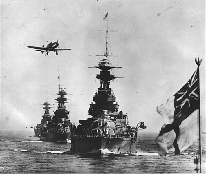 70p- Circa 1940: A Blackburn Skua two seat fighter and dive bomber of the Fleet Air Arm with arrester hook and wheels lowered, flying over warships of the British Fleet. (I believe it are British battleships in line but I have not any name, who can help?)