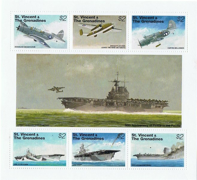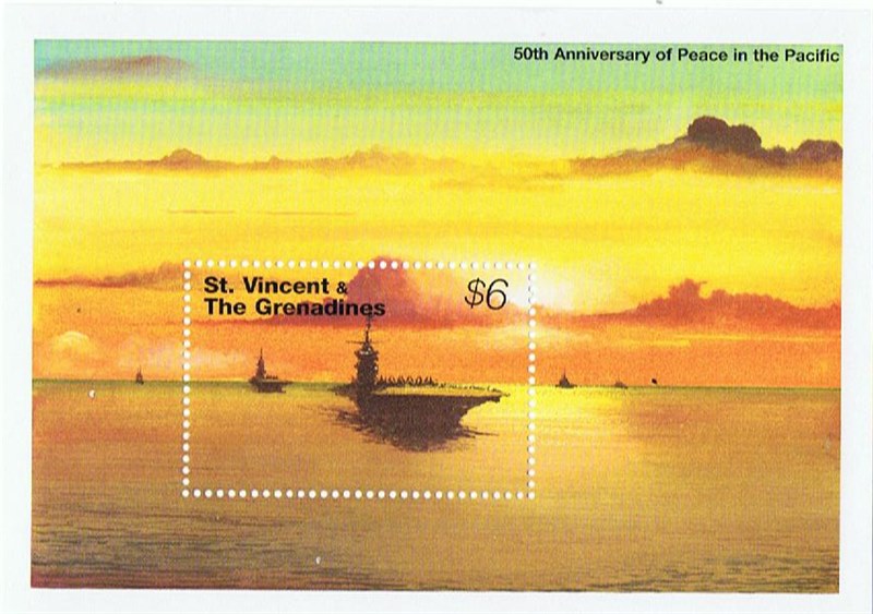 St Vincent & Grenadines issued a miniature sheet for the 50th Anniversary of peace in the Pacific.