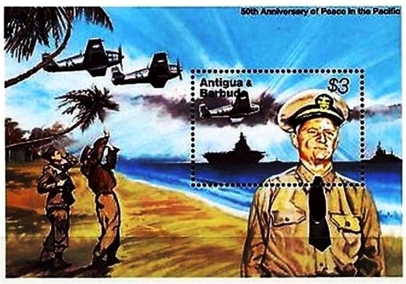 Antigua & Barbuda issued a miniature sheet for the 50th Anniversary of Peace in the Pacific, the MS shows us in the stamp a US Aircraft carrier and in the border a warship. Both have not been identified.