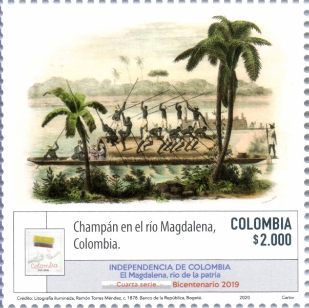 The stamp is designed after a colored aquatint made circa 1860, and shows us a champán which transport a white family over the Magdalena River.