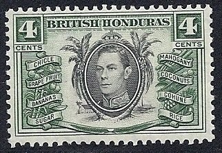 The stamp of 1938 issued by British Honduras shows us banners, within the banners are given the product names important for the economy of British Honduras. Also an image of the British King George VI.