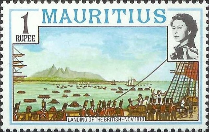This stamp of Mauritius designed after an aquatinting gives a view from the deck of the UPTON CASTLE a transport, of the British Army of the landing at Île de France made by R. Temple, The aquatinting is now in the National Maritime Museum, Greenwich.
