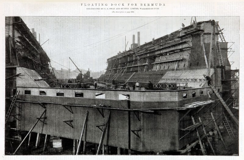 “It was Colonel Clarke, Director of Works of the Royal Navy shipyard, who suggested the construction of a floating dock according to the invention of Messrs. Campbell Johnstone and Co. and it was this shipyard that built HM Floating Dock Bermuda in North Woolwich, England. Employing as many as 1,400 workers, construction commenced in August 1866 and was completed in May 1869.