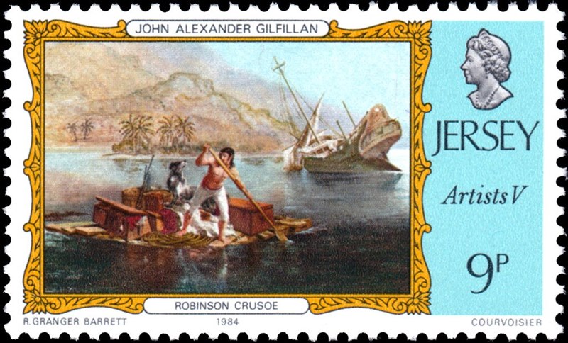 1984 Jersey issued a series of stamps to honour Jersey born painter J.A. Gilfillan https://nzhistory.govt.nz/media/photo/j ... -gilfillan One of these stamps shows Robinson Crusoe leaving the ship CINQUE PORTS, to settle down as a castaway on the island Juan Fernandez Archipelago. I don’t think that the artist ever had been on the island, and the vessel was not wrecked there.