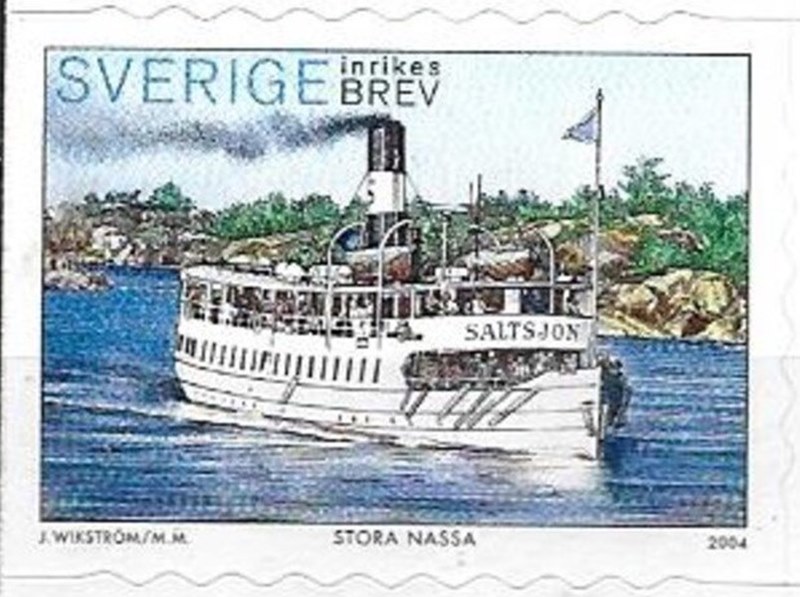 Stora Nassa, firmly ensconced in the outer archipelago, offers high cliffs and narrow sounds. There are as many islets and rocky outcroppings as there are days in a year, some say. This is probably a modest estimate. The passenger vessel in the foreground is the SALTSJÖN.