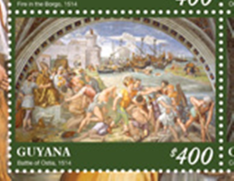 The Battle of Ostia (Battaglia di Ostia) is a painting made 1514-1515 by the workshop of the Italian Renaissance artist Raphael. The painting was part of Raphael's commission to decorate the rooms that are now known as the Stanze di Raffaello, in the Apostolic Palace in the Vatican. It is located in the room that was named after The Fire in the Borgo, the Stanza dell'incendio del Borgo, and was inspired by the naval battle fought in 849 between the Saracens and a Christian League of Papal, Neapolitan, and Gaetan ships. In the painting, Pope Leo IV, with the features of Pope Leo X, is giving thanks after the Arab ships were destroyed by a storm.