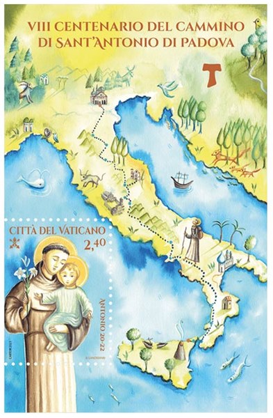 For Fernando Martins de Bulhões, the future Saint Anthony, the choice to become a friar stemmed from the meeting with some of the first Franciscans, five Italian missionaries leaving for Morocco where they suffered martyrdom. Inflamed by their example, he wanted to follow in their footsteps. He too left immediately for Morocco, but when he arrived in Africa he became seriously ill. At this point, he would have liked to return to Portugal, but in the spring of 1221, a furious storm forced his ship to change course and land in Sicily where he was welcomed by the friars of Messina, who made him regain his lost vigor and announced that Francis, the founder of the Order, had summoned them to Assisi for the great gathering of all the friars of the time, called the Chapter of Mats. Antonio then left, walking up Italy until reaching Assisi, where for the first time he met St. Francis. Since then, animated by the Spirit, he has made himself known and appreciated as a great man of the Gospel and charity, a friend of God and friend of men, especially of the poorest, so much so that he still remains today in everyone's heart, known in every corner of the world, with the name of Sant'Antonio di Padova. The anniversary leaflet, created by the illustrator Bimba Landmann, depicts in value the Saint holding the Child Jesus, and on the right a stylization of Italy where his path is traced from Milazzo to Padua. Especially of the poorest, so much so that it still remains in everyone's heart today, known in every corner of the world with the name of St. Anthony of Padua.