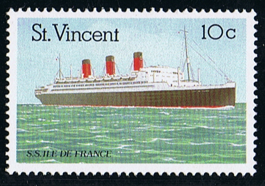 ILE DE FRANCE,„Cie Gener4ale Transatlantique, Havre, built by Atel. de St. Nazaire. Gross 44,356; net 21,494; dwt., 12,245 tons. Length 792'11”; beam 91'11"; draught 34'1". Fitted with catapult ramp at stern, 1928, for aircraft mail carrying by Lufthansa planes. Stamp is from a photograph now in Lufthansa archives. Ship broken up in Japan, 1958. (Falkland Islands, 1974, 16p, SG303).