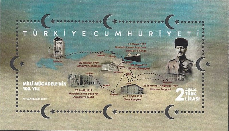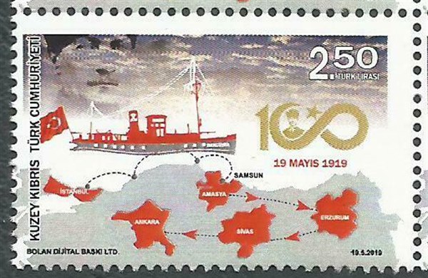 For the Centenary of the beginning of the Turkish War of Independence, Turkish North Cyprus issued one stamp in 2019 which shows the cargo vessel BANDIRMA in the Black Sea on her way from Constantinople to Samsun with onboard Mustafa Kemal Atatürk.