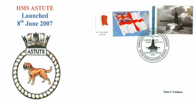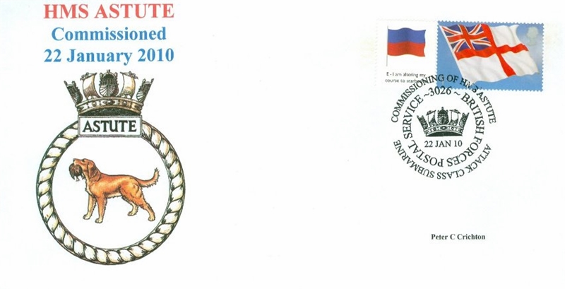 On 22 January 2010 Royal Mail produced a special cancellation for the commissioning of HMS ASUTE. However, the commissioning did not take place until 27 August 2010. It should be noted that Royal Mail regulations require that all artwork for special cancellations be received at least 6 weeks before the date they will be used. The general public and the sponsor of the cancellation were not aware that ASTUTE had not even started sea trials at this time.