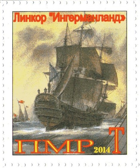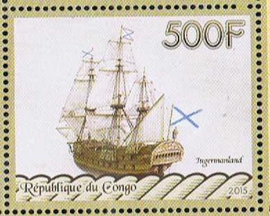 The Ingermanland, launched at St. Petersburg in 1715, is the vessel shown on the 12k. stamp. This 64-gun ship was the favourite ship of Peter the Great and was his flagship from the year 1716. Three years later she had to be repaired owing to damp rot in her timbers, which were of Russian oak. According to a contemporary member of the ship's crew, "the Tsar ordered holes to be cut two feet above the waters edge, fore and aft, to give the air a free passage between the ship's sides and the ceiling." This is a ambiguous. The eye-witness' account does not say if the holes were cut in the outer-planking or hull. This short distance above the water's edge possibly might be all right if the vessel stayed in port in an absolutely upright, stationary position. Under sailing conditions she would certainly suffer the fate of the Royal George, sinking as a result of the entry of sea-water. On the other hand, if the holes were cut in the ceiling or inner planking, sea water would not enter but the circulation of free air between the two skins would be almost negligible with the hatches battened down at sea or in bad weather. Presumably the holes were cut in the inner skin or ceiling. The problem today is solved by air-conditioning. The Ingermanland was included in the Russian Navy sea-going ships list in 1721, in command of Capt. Bredale; she was considered unseaworthy in 1724. SG4019