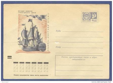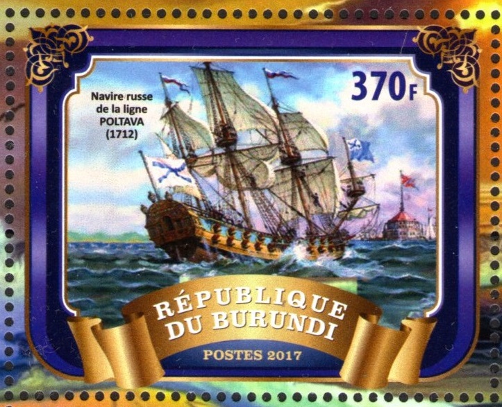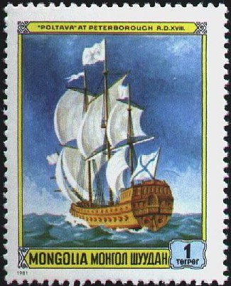 The Poltava, the ship depicted on the 10k. stamp, was launched at St. Petersburg in 1712, her principal builder being the Tsar Peter the Great. A ship of 54 guns, she did not come up to her builder's hopes, being a poor sea vessel. She was too narrow aft and could not ride in a heavy sea. Many of her crew were soldiers, transferred to make up the ship's crew, without any previous sea experience. The ship was named in honour of the great Russian Army victory over the Swedes at Poltava in 1709. Her timbers being affected by damp rot, the Poltava had to be rebuilt at St. Petersburg in 1719. There was no dry dock and she could only be repaired above the water level. She had to be rebuilt again in 1723. SG4018