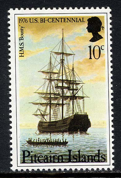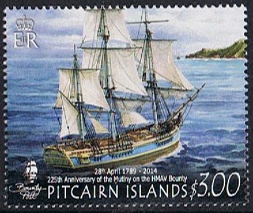 The picture of armed vessel Bounty (Capt Bligh) on the 6d Pitcairn Islands stamp is built up from details supplied by the Admiralty, there being no authentic picture of the Bounty existing. She was not built for, but was acquired by, the Royal Navy. This vignette, therefore—like the Merlin vignette— is purely a representation of a ship of the period, and both stamps appear to be the work of the same artist. There is a very strong likeness between the two ships, and the artist has given both vessels starboard shrouds, but none on the port side. The Bounty was formerly named Bethia, and was bought by the Admiralty from Richard Bentham, father-in-law of Bligh for £1,950. She was armed with four 4pdr. guns and 10 small swivel-guns, carried a crew of 46 and displaced 215 tons, her overall length being 90ft and her breadth 24ft. The story of the mutiny is too well known to need recapitulation.