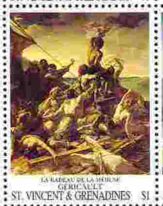 The Medusa was wrecked on the Arguin Reef. There were 400 people on board, made up of troops, passengers and crew. Her six boats could only accommodate 250 persons, so a raft was built of ship's spars and timber. It was 66 ft. in length and about 22 ft. in width, but only the centre portion could accommodate people. The only supplies placed on the raft were casks of wine. Midshipman Coudin, incapacitated by a leg injury, became the raft's commander. At the outset the raft was towed by two of the boats, but the tow ropes parted (it is also claimed that they were cut) and the raft, with 146 men and one woman, was abandoned to its fate. Seventeen days later 15 survivors, all that remained of the 147, were rescued by the Argus which had sailed from St. Louis to search for the raft. The design of the stamp is based on an oil Painting by Jean Louis Audie Theodore Gericault, painted in 1818-19 and depicts the sighting of the Argus by the survivors on the raft.
