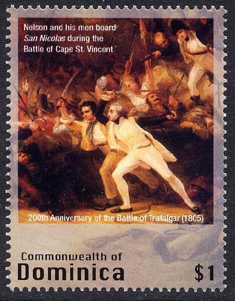 The Grenada mini-sheet of the 200th Anniversary of Battle of Trafalgar shows Nelson, Napoleon Boneparte, HMS Victory and, from a painting by William Marshall - "Nelson's Band of Brothers", but more correctly "Nelson explaining his plans for the Battle to his captains".(7)