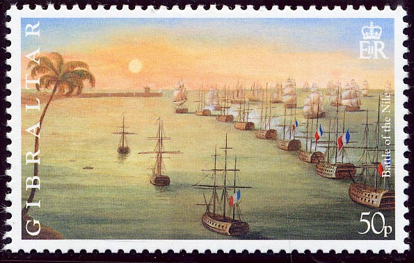 The portrait by Lemuel Francis Abbot, used for the 47p Gibraltar stamp (5) shows Nelson wearing his foreign decorations including the chelengk, given to him by the sultan of Turkey, in his hat.