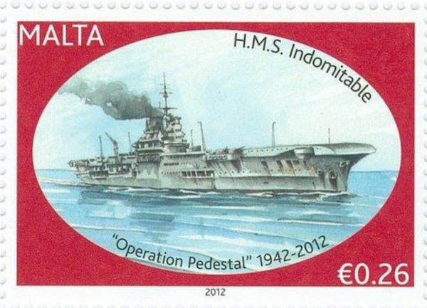 40 Stuka dive-bombers attacked her later during the passage to Malta and three bombs hit the flightdeck, setting the flightdeck on fire. The stamp design is made of a photo taken from the HMS VICTORIOUS during the Operation Pedestal on 10 August 1942, the low flying plane is an Albacore, the higher one is included in the design. The aircraft carrier behind the INDOMITABLE is the HMS EAGLE that was lost in this operation.