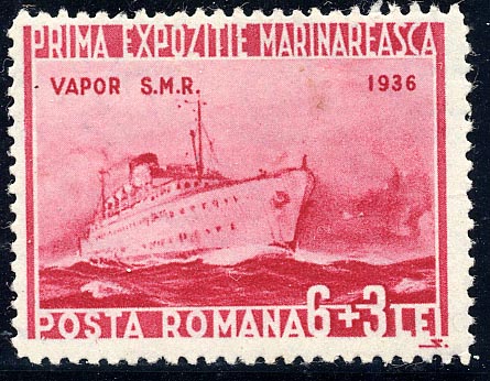 The first Maritime Exhibition to be held in Rumania took place a Bucharest in 1936 and to commemorate the event the Rumanian Post Office issued a set of three stamps or October 8 of that year, the values being 1+1 lei, 3+2 lei and 6+3 lei the surcharges being devoted to sea men's charities. These stamps were designed by a talented Rumanian naval officer, Comdr. Dumitru Stiubei, who was also responsible for designing the ship stamps of 1931 issued to commemorate the 50th anniversary of the Rumanian Navy. The 6 + 3 lei stamp depicts the motorship Transilvania. When this stamp was designed the vessel was still in Copenhagen in the yard of her builders, Messrs. Burmeister and Wain, and the artist was obliged to use a preliminary outline sketch as the basis for his stamp illustration. As a result, his picture varies slightly from the appearance of the completed ship.