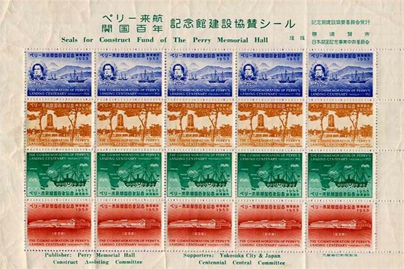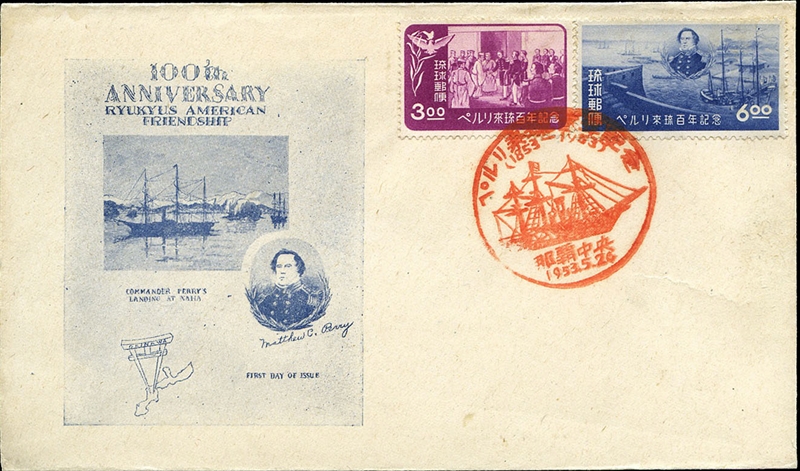 Three stamp issues have paid tribute to Commodore Perry on the occasion of the centenary of the opening of Japan to foreign traders. The United States issued a single 5 cents stamp; the Ryukus Islands have brought out two and a commemorative set of four stamps comes from Yokasuka City, Japan. In 1638 Japanese ports were closed to the majority of foreign vessels except those from China and a few from Holland. Japanese oceangoing junks were kept in home waters and the construction of further craft of this type was stopped. For over two centuries Japan remained isolated but in 1852 the United States attempted to break the embargo. Commodore Matthew C. Perry, U.S.N., was chosen as an envoy and given command of a fleet of four ships— the USS. Susquehanna, Mississippi, Saratoga and the Plymouth. The fleet anchored off the town of Uraga, 27 miles from Yeddo, now Tokio. On July 13, 1853, after several days of negotiating, a letter from President Fillmore of the United States was eventually delivered to the ruler of Japan. As a result, on March 31, 1854, a draft treaty was signed and Japan once again was open to foreign ships and resumed trade across the seas. Each of the three stamps carries an inset portrait of Commodore Perry and his ships.