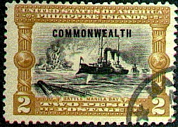This stamp shows the Battle of Manila Bay on May 1st 1898. The USS Olympia, a protected cruiser under the command of Commodore Dewey, shown leading the American Fleet into action and blowing up the Spanish flagship Reina Christina. Astern of the Olympia is the USS. Baltimore. The engagement resulted in the whole of the, Spanish squadron in Manila Bay being sunk or burned, while the Americans lost neither a ship nor a man. The Olympia, which was launched in 1892 and cost £359,200 to build, had a displacement of 5,800 tons, a length of 340ft., a beam of 5311, a draught of 21.6ft., an ihp of 13,500, a main armament of four Sin 10 Sin and 14 6pdr. guns, and a speed of 21 knots.