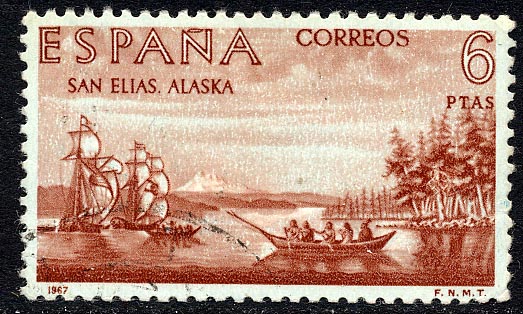 A Spanish set of stamps commemorates the visit of two warships to Prince William Sound on the north-west coast, sailing from San Blas, Mexico, on March 8, 1788. The Spanish authorities in Mexico and California had heard of foreign encroachment in the far north-west and decided to investigate. The two ships sent for the purpose were the frigate Princesa and the smaller packet boat San Carlos. The expedition was commanded by Alferez (Lieutenant) Esteban Jose Martinez and Gonzalo Lopez de Haro. Their instructions were to go to the far north to inspect the reported Russian establishments and to evaluate their strength and future potentials; to examine the coast southwards to Monterey, making frequent landings for exploration and taking possession when considered suitable for the establishment of permanent strongholds. The two vessels went directly to Prince William Sound, arriving very early in the season, but did not meet any Russians or other foreigners. Some landings were made for the purpose of taking possession. The vessels became separated in bad weather and Haro sailed the San Carlos westwards, reaching Kodiak Island, where the Russian settlement of Three Saints had been established. Delaroff. the Russian commander of the post used his intelligence. With great freedom and candour he gave Haro all the information he required about the Russian settlements along the Western Aleutians to Nootka, where he reported the building of a powerful fortress. He admitted the Russians had also many heavily fortified establishments along the coast giving precise details. His exaggerations were believed by Haro, who accordingly reported them to Viceroy Flores of Mexico.