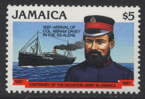 The stamp depict the vessel with Col. Abram Davey of the Salvation Army, she brought in 1887 the Colonel to Jamaica, where he on the island founded the Salvation Army.
